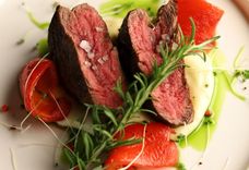 Стейк из говядины с пюре из цветной капусты и печёным перцем